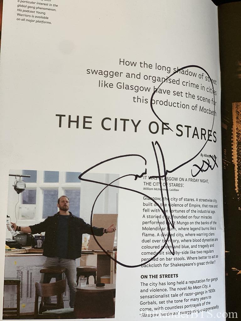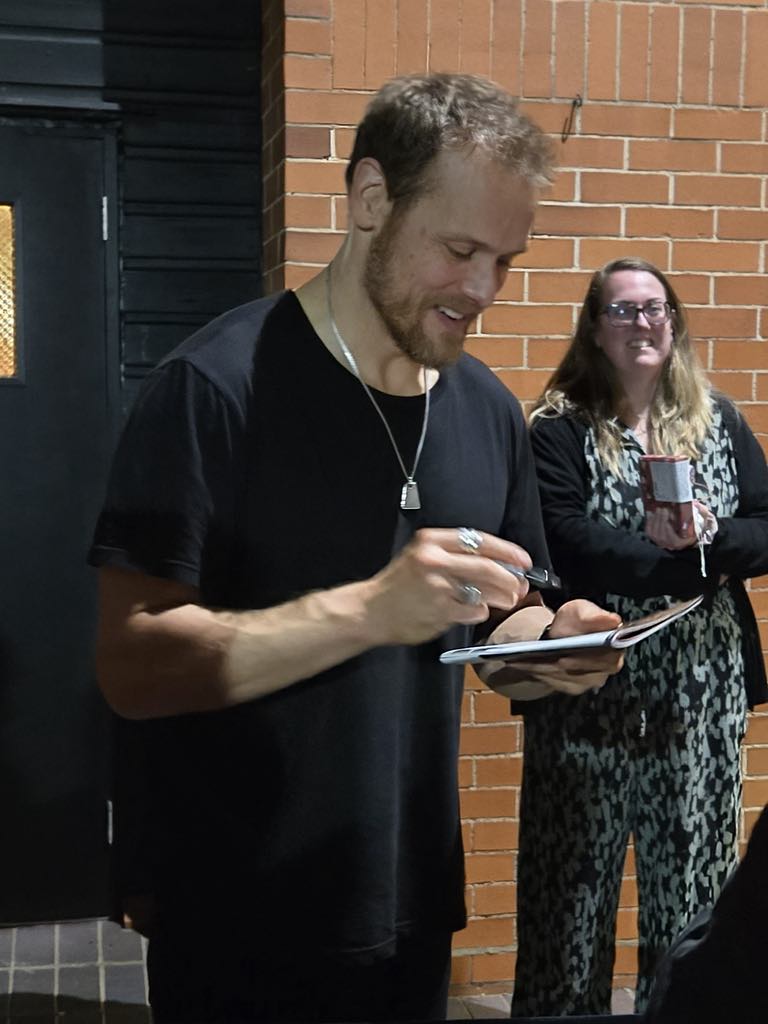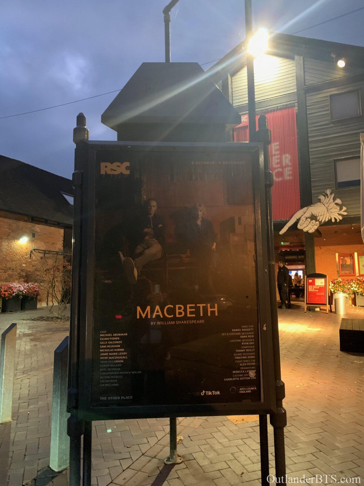 I was there at The Other Place for Sam’s performance on October 28th, and as you suggested, he had definitely reached his stride and seemed totally immersed in his role. He did make a lot of eye contact with the audience as you noted. He was a very powerful presence when on stage. I thought he did splendidly. Our audience did not seem to be primarily Outlander fans, although I have to admit that just looking at someone and sizing them up by their age and attire is not very empirical, but I marveled at how many of the towns people seemed to have turned out for Macbeth. Sam did come out of the stage door (with a “security” guard who looked 20 years old, a foot shorter, and not like he could be very effective in case of an incident) after the show and greeted the crowd of about 30 people. He was very gracious and talked to everyone as he signed their programs. He looked like he had just had a workout (staring in Macbeth IS a workout!) but was his charming self. I told him I had come from California to see the play and he said he certainly hoped I had enjoyed the show after taking such a long trip…….