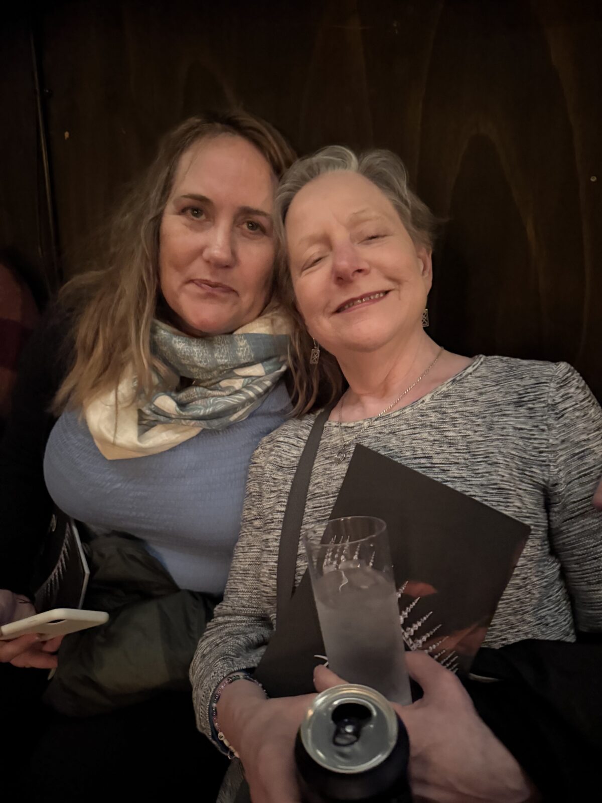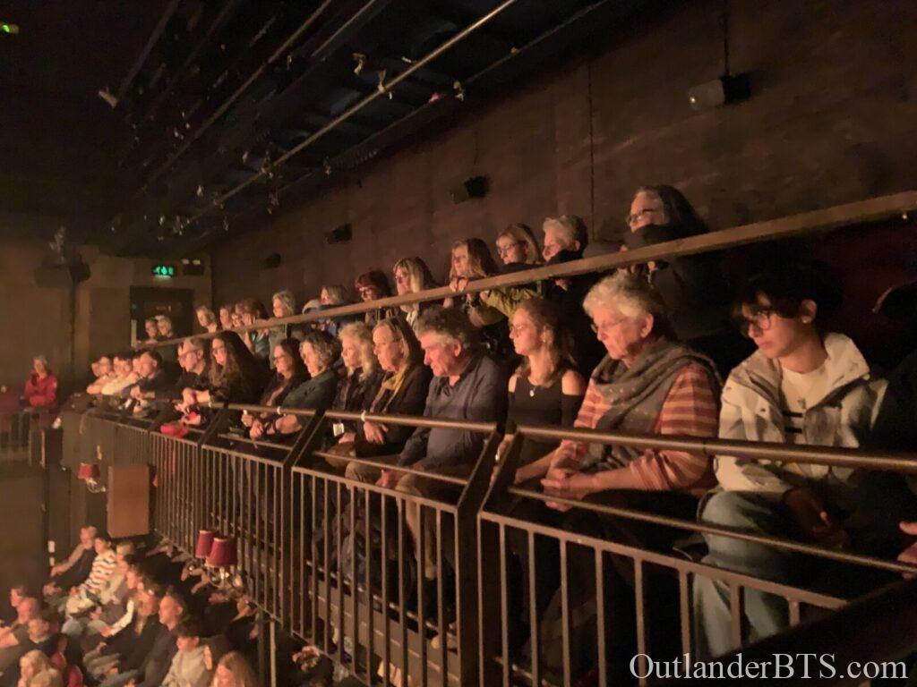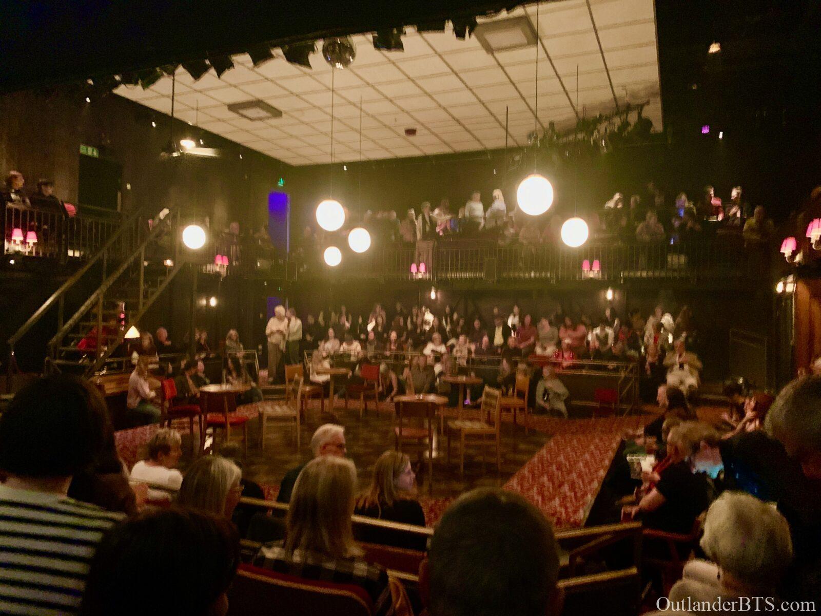 I walked in and looked around. They were selling programs, so I bought one. I had just gotten up from the dinner table, so I didn’t need anything to eat or drink. Almost immediately, I saw an Outlander friend (who is also a longtime patron of my site), Rosanne, who was there with her niece and had just done a trip with her 20-something-year-old great-nieces, including Land Con in Edinburgh. We caught up about that in line, and as we entered the theater, I was astonished to discover that our seats were right next to each other! We were on the ground floor in the high (or stool) seats against the wall. Here was our view of the theater. This is pre-show.
