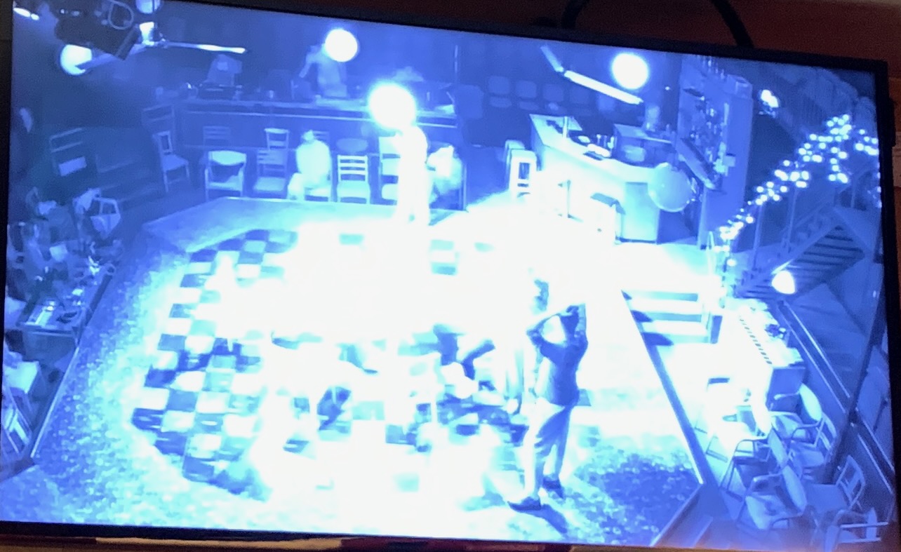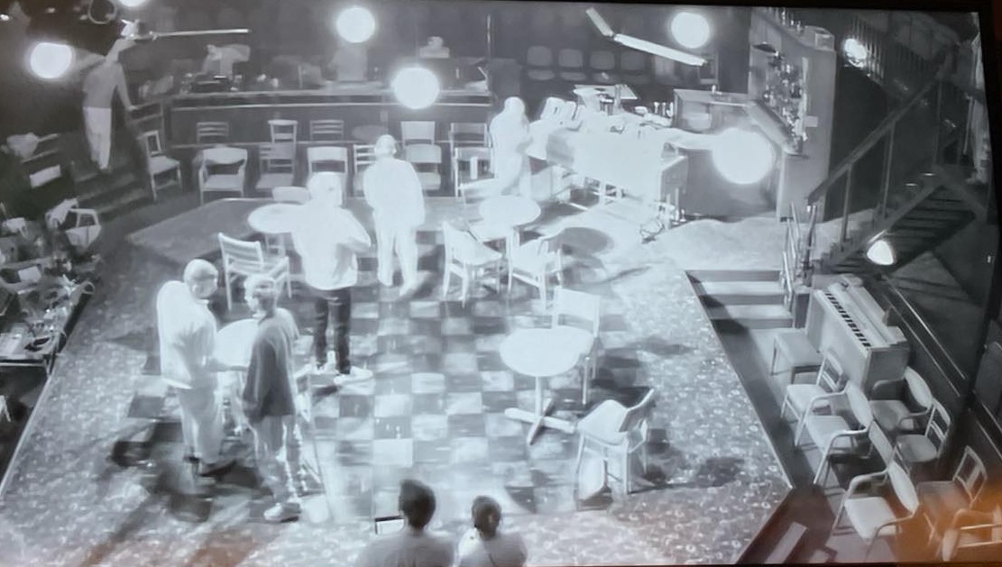 I also had a coffee after dinner on Oct 15! I had had time to think about the play, and process what I’d seen when I went into the second viewing. I also learned that opening night on October 9th kicked off the play’s run of preview performances, during which time, adjustments and refinements were still being made. The production was finalized around its official press night on October 21, and from that point, the show is considered “set” and remains essentially the same for the rest of the run. It was really fun for me to notice the similarities and differences in the play between the first and second viewings. In fact, on the day of our tour group viewing (Oct 15), our group did a costume tour (split into two groups), and the company was rehearsing during our costume tour! Karmen was in the first group at 2:30PM, and took a photo of the closed circuit tv. With her anatomical prowess, she assures me that the tall figure in the black pants in her photo is Sam.