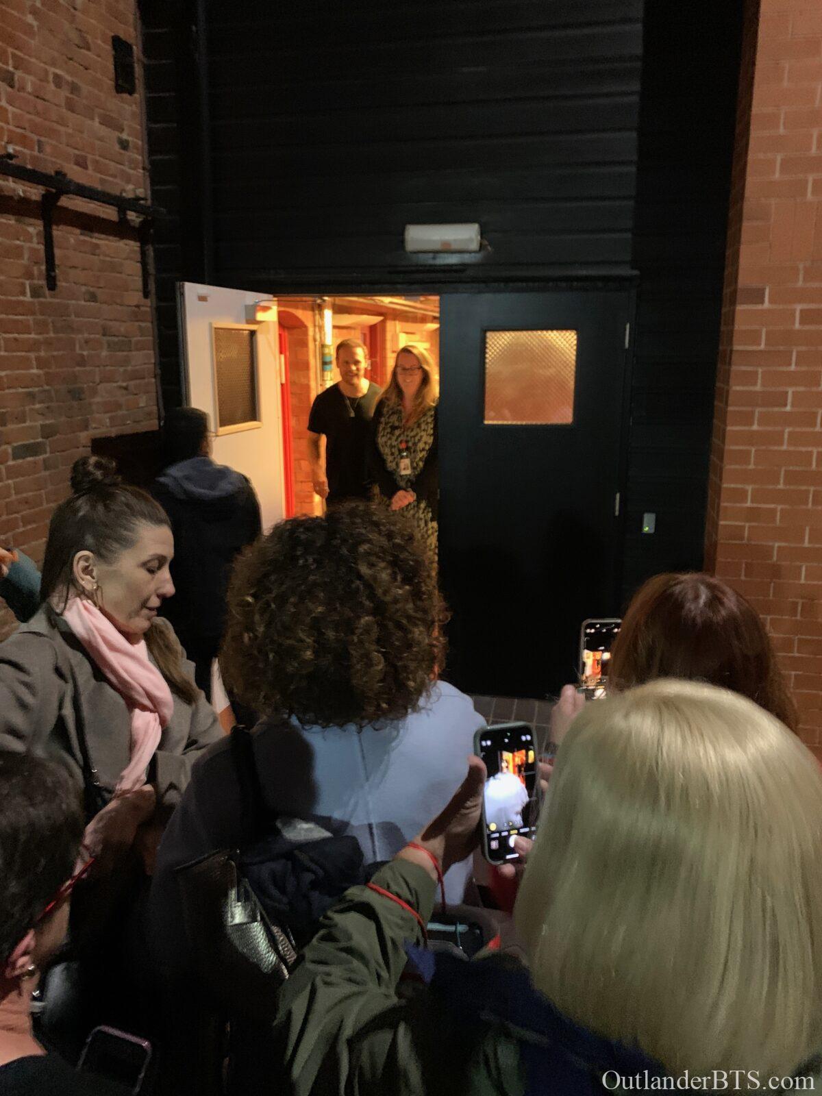 They clearly arrived sometime before 2:30PM to rehearse, and then probably breaking for tea or dinner, and then would come right back afterward and start getting ready for the show, and not be finished (if you include stage door time, which Sam has been doing every night), until 10:15 to 10:30PM. I’m interested to know how this compares to Sam’s 12-14 hour days on Outlander. Not as much sitting around, but less total hours.